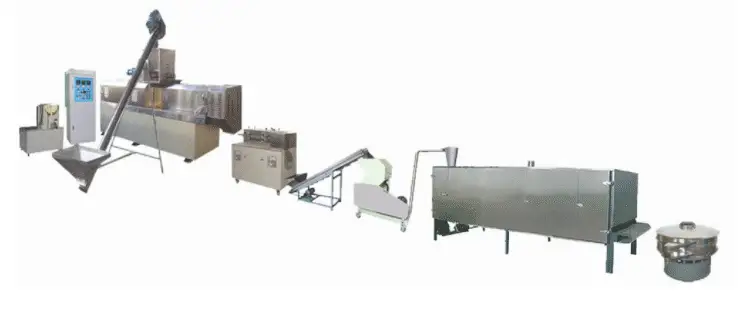 Bread Crumbs Production Line is the most commonly used equipment for making bread crumbs and also the best equipment. It consists of a flour mixer, screw elevator, twin-screw extruder, elevator, crusher/grinder, conveyor, sifter, dryer, cooler, and packaging machine. The process flow is raw material preparation, grinding, mixing, extrusion, drying, crushing, cooling, and packing.