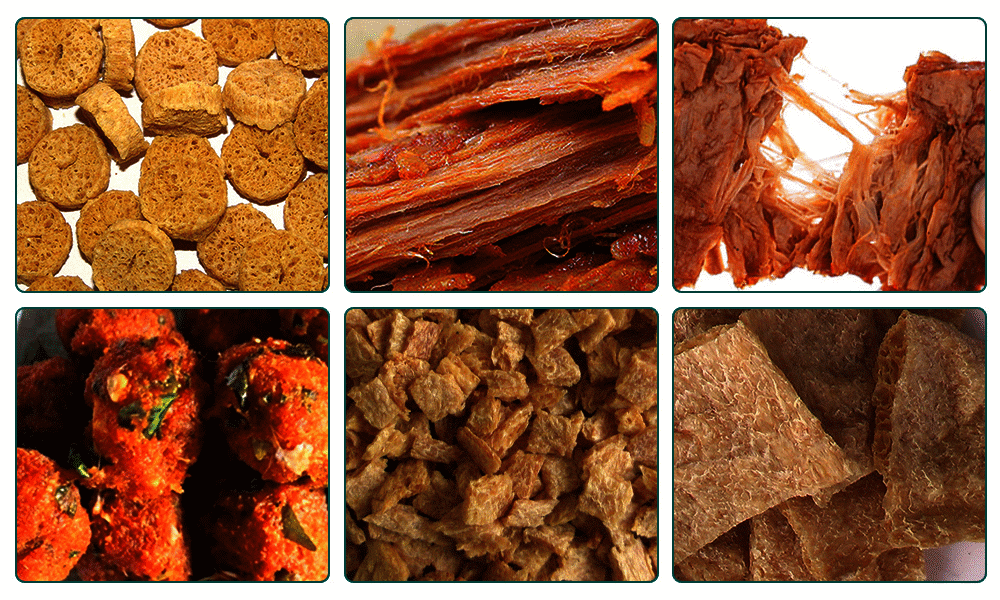 After being extruded by an extruder, protein products with different structures and shapes can be obtained, such as soybean nuggets, textured protein, soybean crushes, etc. The produced fiber product has better water absorption and is by far the best substitute for animal meat. Textured protein does not contain cholesterol and animal fat, so it is widely used in the meat industry, fast food production, frozen food production and various snacks.