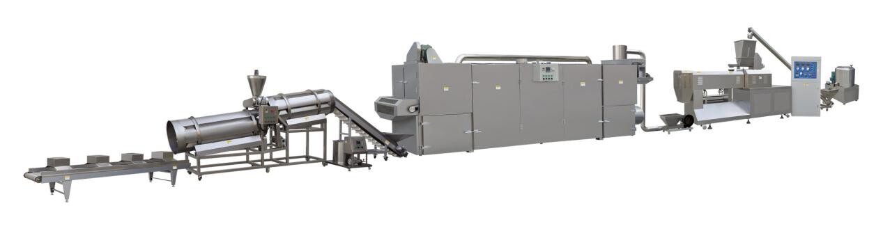 The pet feed production line is an equipment system specially used to produce pet food. It is composed of a series of mechanical equipment, mainly including: powder mixing machine - screw conveyor - twin-screw extruder - air conveyor - oven - automatic seasoning line.