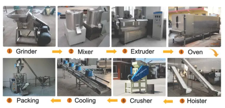 La línea de producción de Kurkure consta principalmente de una mezcladora, un transportador de tornillo, una extrusora de un solo tornillo, una máquina cortadora, un horno para hornear, un transportador de enfriamiento y una máquina empacadora. Toda la línea está altamente automatizada y es fácil de operar, y su flujo de proceso es el siguiente.