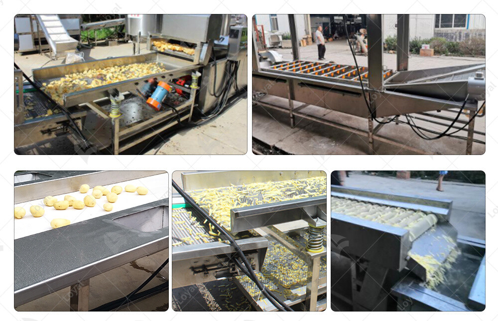 5.Rinsing Machine:The cut potato chips fall directly into the rinsing machine, and are washed by bubbles and waves, so that the potato chips are in the rolling state, the starch on the surface of the potato chips is fully washed.