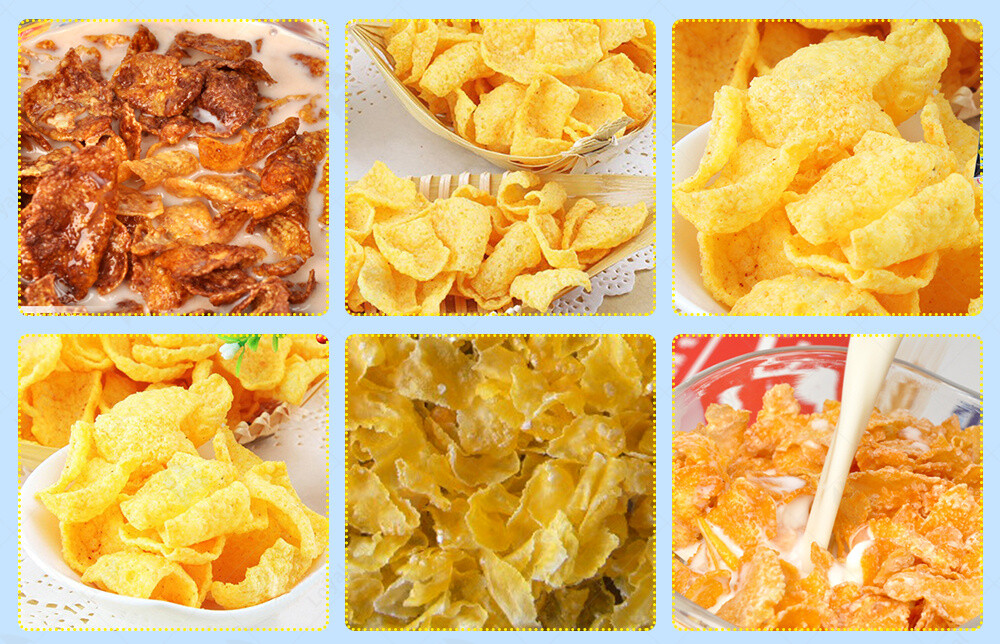 We share our corn flakes manufacturing process knowledge to process healthy and balanced products made with wholegrain cereals or including a mix of multi-grains like corn, wheat, oats, rice, barley, rye, Buckwheat or barley. Our automated corn flakes manufacturing process production lines are used to produce consistently high quality products while keeping the same organoleptic characteristics as traditional flakes.Corn flakes manufacturing process change molds and choose the right process to produce circles, balls, sheets, stars, letters and other products,and produce core filling snack food, filling biscuit ,nutrition breakfast, corn flakes and other puffed foods.