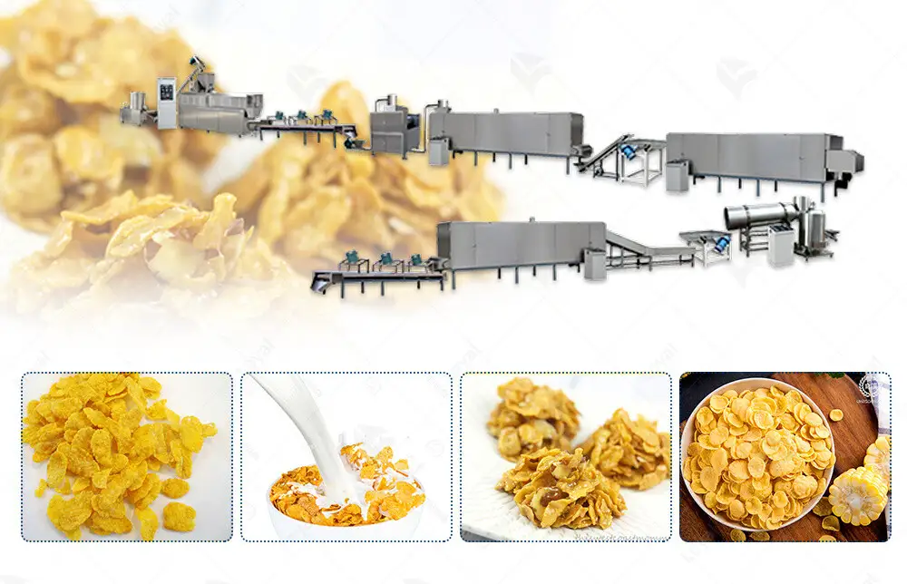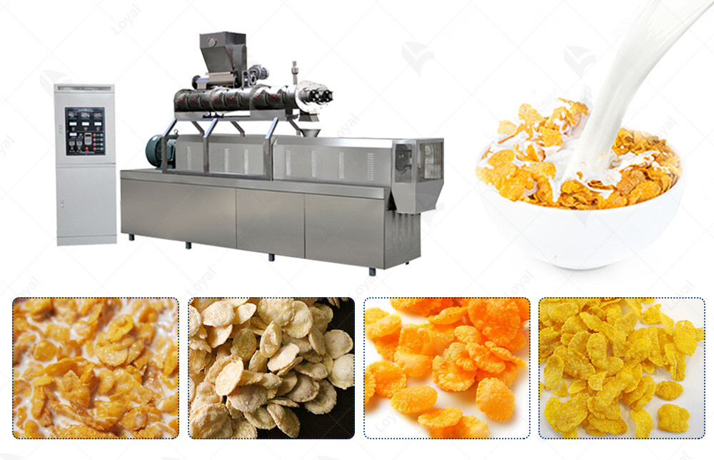 Corn flakes making machine is from twin-screw extrusion lines produce cereal flakes, both plain or coated. The twin-screw extrusion technology is at the core of this very flexible and scalable process. Corn flake machine is includes mixing, food extruder machine ,corn flake machine, drying, Hot air dryer, flavoring and so on . Corn flake machine or breakfast cereal machine technology is ideal to meet the market demands and corn flake breakfast cereal manufacturing : Corn flakes/Breakfast cereal is a kind of crispy food, with the characteristics of hard to be steeped broken and strong grain taste. It can be used as a snack, and many raw materials are eligible with coating recipes such as sweet syrups, honey, chocolate and other compositions.Then the corn flakes and cereals snacks can serve with milk and coffee.
