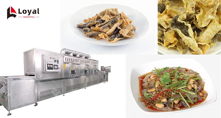 Fish skin is a highly valuable protein source because of its high content of essential fatty acids and proteins. Fish skin can be dried and then used for various products such as foods additives, pharmaceuticals, cosmetics, energy supplements and other materials. The industrial microwave oven tunnel fish skin microwave drying and puffing machine can provide an effective means of drying and puffing fish skin to produce these products.