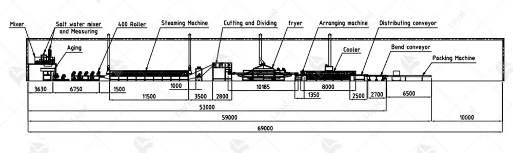 ALKALI WATER MIXING TANK---ALKALI WATER MEASURING DEVICE---FLOUR MIXER---ROUND DISK AGING MACHINE---ROLLING &SHPAING MACHINE---STEAMING MACHINE---NOODLE CUTTING AND DIVIDING MACHINE---FRYING MACHINE---HEATING EXCHANGER---OIL FILTER---OIL CIRCULATING PIPELINE---OIL TANK---ARRANGING MACHINE---COOLING MACHINE---CONVEYING MACHINE