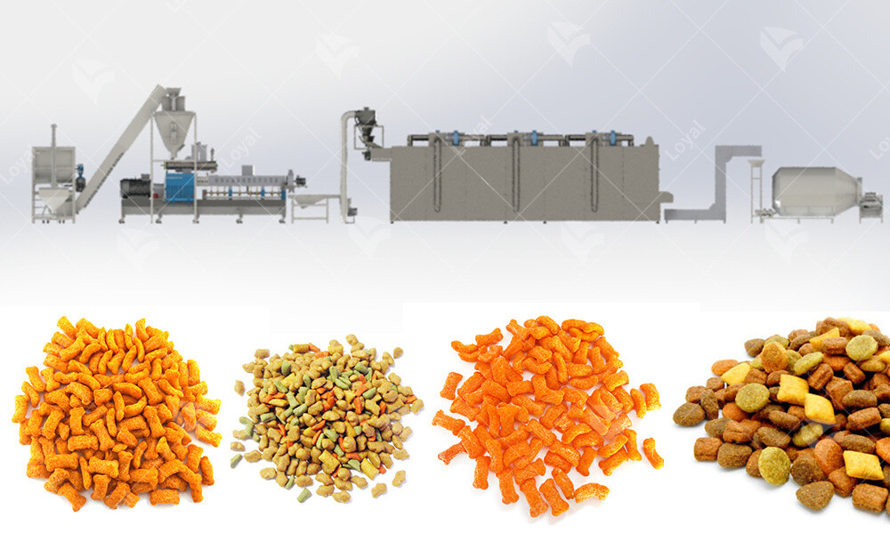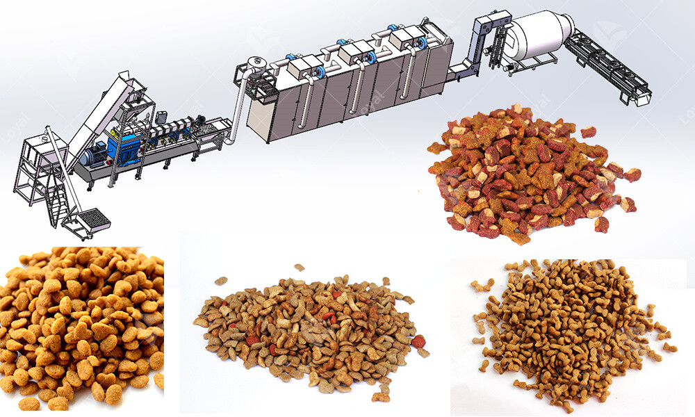 A large pet feed production line typically involves several stages of processing and packaging to produce high-quality pet food products.Throughout the entire production process, quality control measures are implemented to ensure the safety and quality of the pet food products.