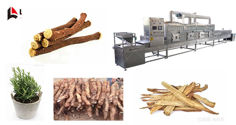Microwave herbaceous plants licorice root drying sterilization machine is a new type of equipment for food industry. It has the features of high speed, low energy consumption, small size and easy operation. The machine has been applied in the production of dried fruits like apricots, peaches, plums, etc.