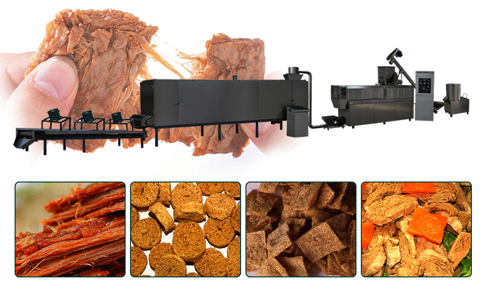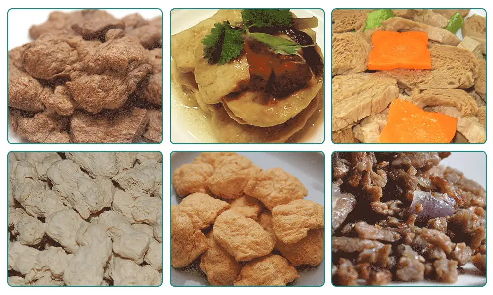 Soya nuggets machine can be used to produce all kinds of protein products, through adjusting the die of extrude, there are cylindrical, square,chunk, flake, shredded meat, diced meat, crumbs, etc. Soy protein is the main raw material for vegetarian meat, vegetarian roast duck, vegetarian balls, instant noodle seasoning bag, quick-frozen dumplings, and ham sausage. It can also produce casual ready-to-eat snacks, shredded vegetarian meat/vegetarian steak, quick burger patties, etc., as well as hot pot and spicy hot pot applications.