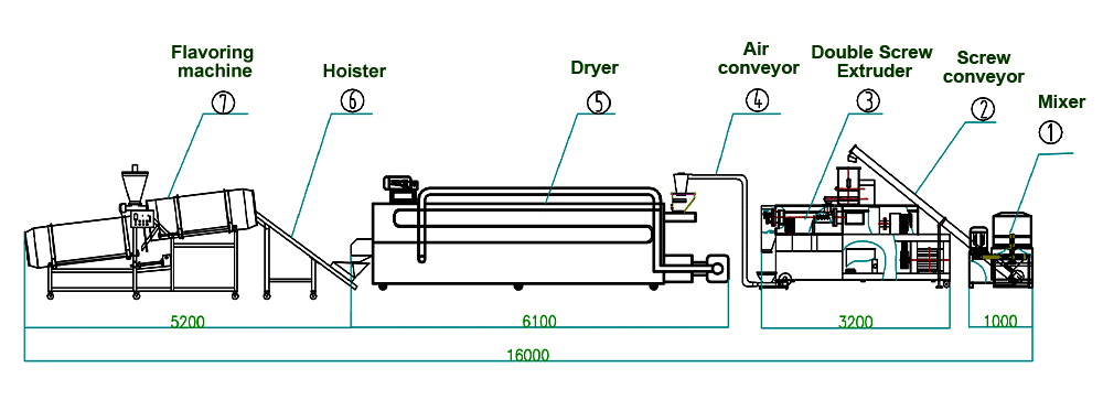 1.Mixer (mixing powder) → 2. Screw conveyor → 3. Twin screw extruder (extrusion, cutting and forming) → 4. Air conveyor (conveying) → 5. Oven (baking) → 6 .Cooling conveyor