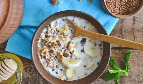 Ingredients: cereals, chopped walnuts, banana chips, yogurt mixed with raisins