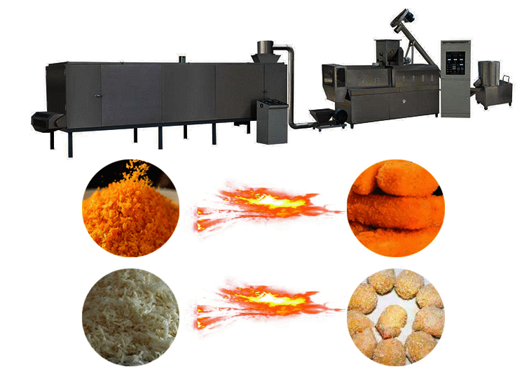 The bread crumb production line is a combination of mixers, conveyors, extruders, ovens, grinders, vibrating screens, packaging machines and other equipment.