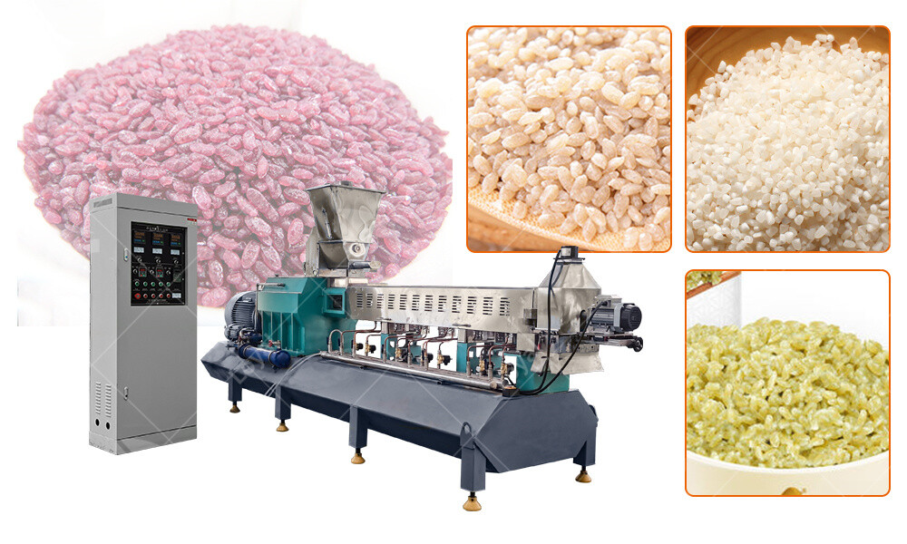 Nutritious rice is mainly developed for the nutrients lost in large quantities in the traditional production line of rice and by-products through the extrusion process to make a product of high value, in the process, broken rice as well as rice bran can be reused. The whole production process is relatively simple: after the crushed rice is combined with a certain amount of water, oil, vitamins and a series of other additives, a high temperature and high pressure environment is formed in the extruder at a certain temperature to cook the rice, but there is also a cooling system in the extruder to make sure the rice is in a cooked but not puffed state, and it is extruded through different moulds to produce the shape we need.