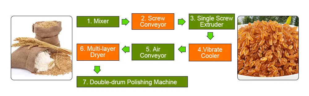 The basic production process of the rice production line is: raw material preparation → mixing → conveying → extrusion puffing → conveying → drying → packaging.