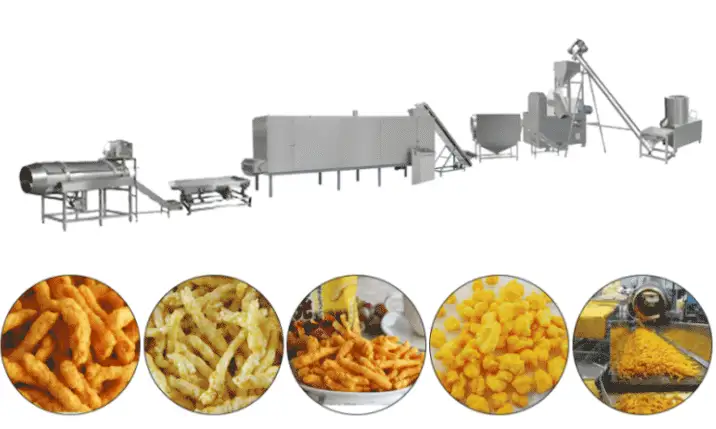 Kurkure Production Line consists of a mixer, screw conveyor, extruder, fryer elevator, flavoring drum, cooler, and packaging machine. The whole line is highly automated, which greatly saves time in the production process, improves work efficiency, and brings considerable economic benefits to food processing plants.
