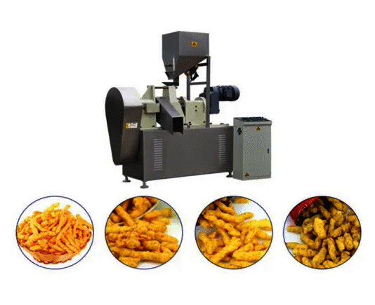 Kurkure making machine is a kind of production equipment for making new extruded small food that uses corn grits as the main raw material, which is extruded and twisted into a curly shape by two turntables. The production line is completed from raw material configuration, extrusion puffing, frying or baking, spraying, and flavoring to the finished product at one time. It can also produce different shapes of puffed food such as sandwich snack food and sandwich cookie, nutritious breakfast, corn flakes, etc.