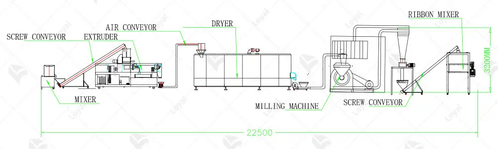 Mixer→ Screw conveyor→Twin screw extruder →Air conveyor→ Multi-layer oven→Crushing machine with dust pelletizing system→Mixer