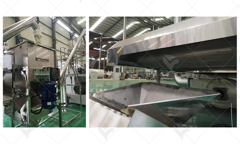 5. Drying and Cooling Equipment: After the dog food has been shaped and cut, it undergoes drying and cooling processes to remove excess moisture and ensure shelf stability. This typically involves passing the product through a drying oven or conveyor system, followed by a cooling chamber.