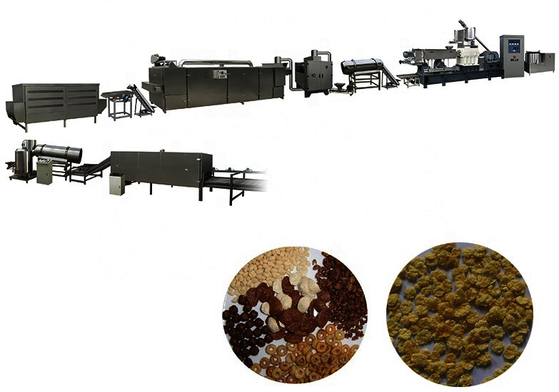 Mixed homogeneous feedstocks are further processed in the extrusion machine. The original material in the extruder will be confirmed and is extruded into the shape of the mold. Replace the mold can produce a variety of cornflakes. Thereafter, dry extrusion molded cornflakes.