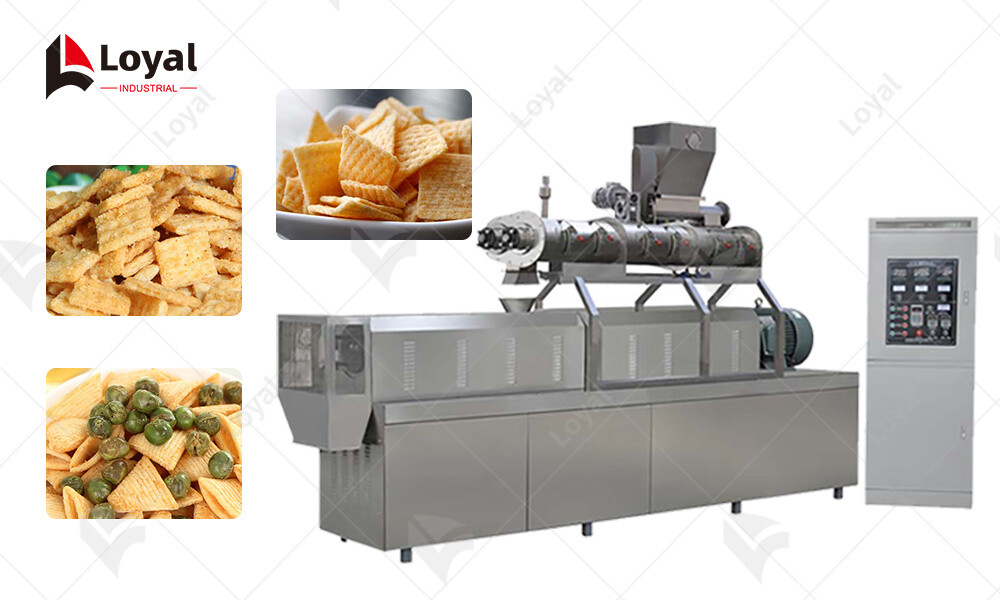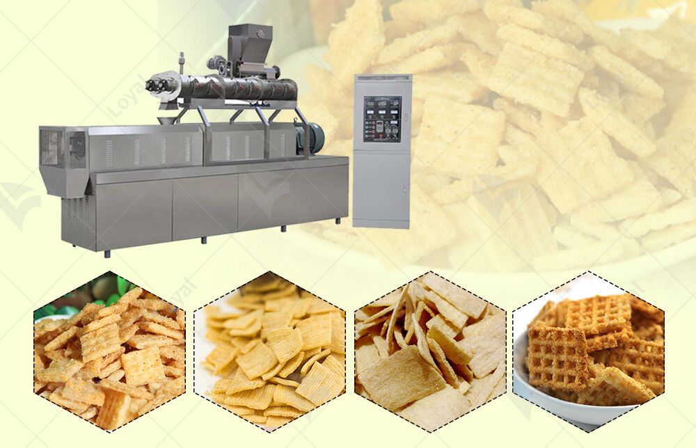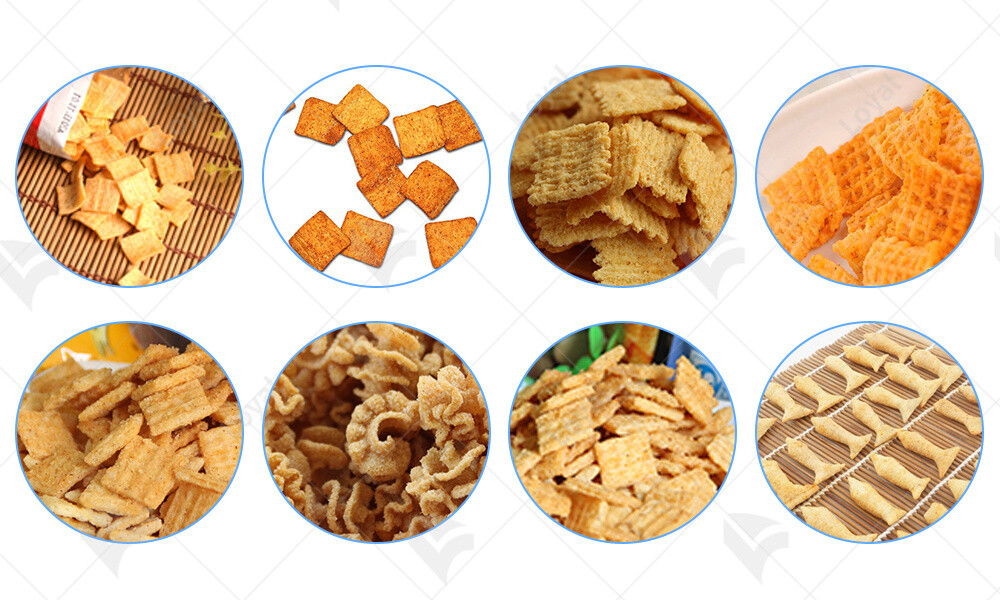 The millet crispy rice crust production line uses a process that evenly mixes millet corn flour, wheat flour, rice flour, starch, sugar, and water, then directly extrudes the mixture into crusts using a twin-screw extruder. The equipment is simple to operate, easy to learn, and can be run by one person. The crispy rice crusts are characterized by their crispy texture, non-greasy taste, lingering aroma, and ability to aid digestion, making them a popular snack for many consumers.